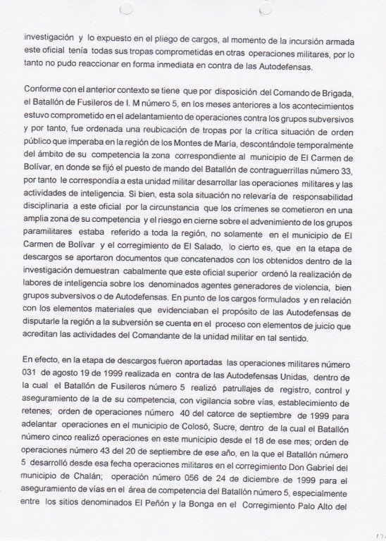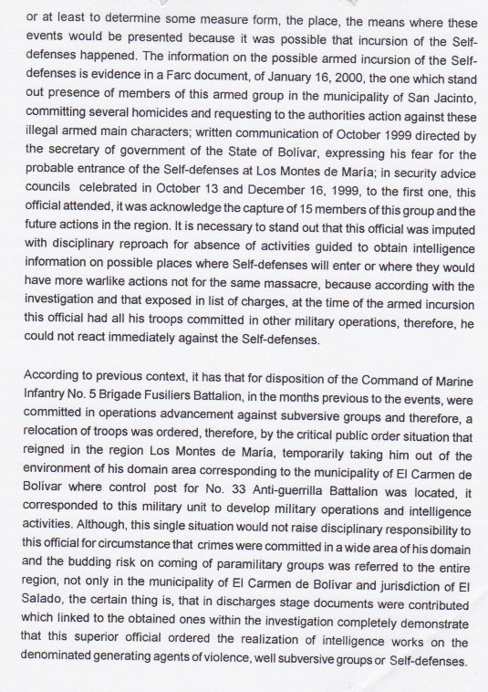 "… According to the previous context, it is that by disposition of the Command Brigade, the Marine Corps Infantry Battalion of Fusiliers No. 5, in the months prior to the events, was committed in advancement operations against subversive groups, therefore, relocation of its troops was ordered due to the critical public order situation reigned in the region of Los Montes de María [María's Mounts], temporarily dimini-shing the environment of its competition area correspon-ding to the municipality of Del Carmen de Bolívar where a control head-quarter of the Contra-guerrillas Battalion No. 31 was placed, therefore, it was the duty of this military Unit to develop military operations and intelligence activities."